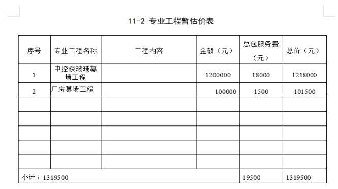 答:按招标文件的专业工程暂估价表报价,专业工程暂估价与总包服务费均为含税金额。工程量清单做如下修改,所有投标人均按包含总包服务费的金额报价: