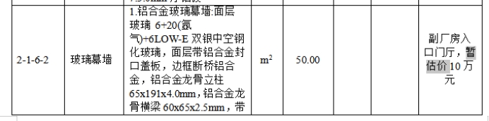 2-1-6-2 玻璃幕墙,单位:项,工程量:1,金额:121800元;